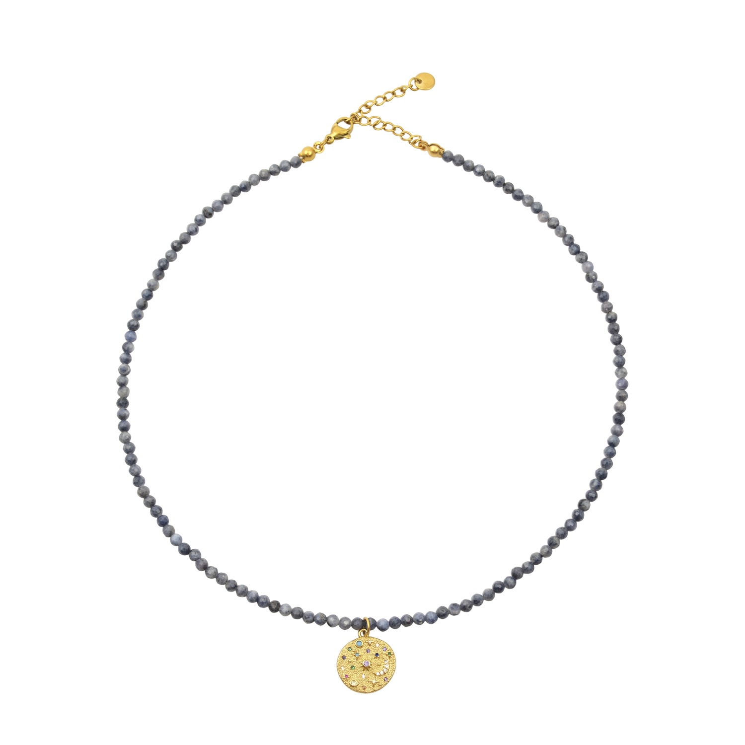 Κολιέ επιχρυσωμένο με ημιπολύτιμο λίθο ζαφείρι και διακριτικό charm στοιχείο. Το ζαφείρι, γνωστό για τις προστατευτικές και ενισχυτικές του ιδιότητες, φημίζεται ότι προάγει τη σοφία, την πνευματική διαύγεια και την εσωτερική γαλήνη. Το κομψό του design ολοκληρώνεται με υποαλλεργικό κούμπωμα από ανοξείδωτο ατσάλι (stainless steel), ιδανικό για ευαίσθητες επιδερμίδες. Ένα μοναδικό κόσμημα που συνδυάζει διαχρονική κομψότητα με θετική ενέργεια.