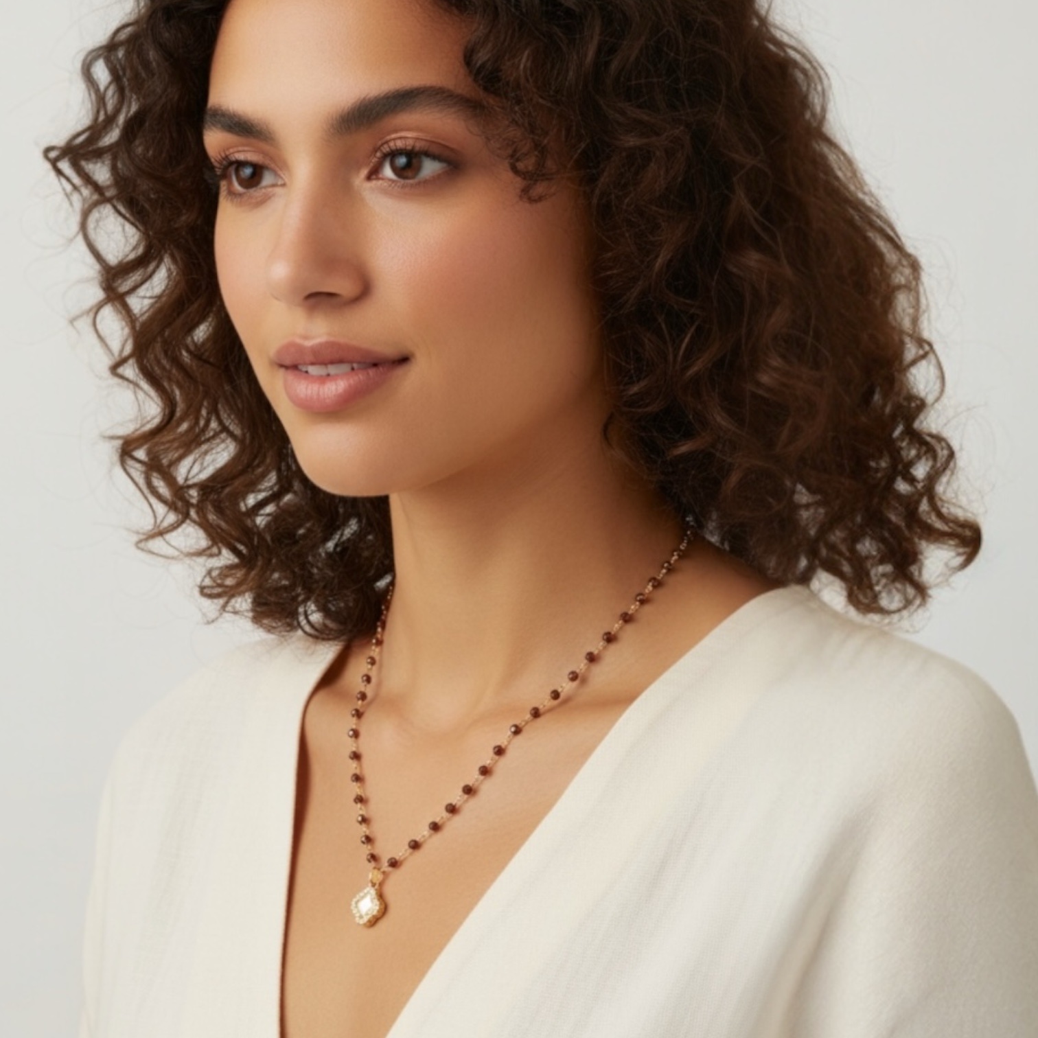 Κολιέ ροζάριο από ασήμι 925, διακοσμημένο με ημιπολύτιμο λίθο Γρανάδα που χαρίζει μοναδική λάμψη και πολυτέλεια. Το κολιέ ολοκληρώνεται με charm σταυρό από ασήμι 925 και λεπτομέρειες από φίλντισι, προσφέροντας κομψότητα και διαχρονικό στυλ. Ένα ιδιαίτερο κόσμημα, ιδανικό για καθημερινή χρήση αλλά και για ξεχωριστές εμφανίσεις.