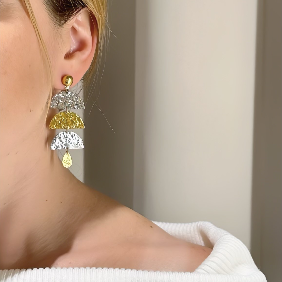 Αναδείξτε το στυλ σας με αυτά τα μοναδικά χειροποίητα σκουλαρίκια Evangeline Glow που μαγνητίζουν τα βλέμματα. Με έναν εκλεπτυσμένο συνδυασμό χρυσού και ασημιού, αυτά τα σκουλαρίκια διαθέτουν ιδιαίτερο σχήμα που προσδίδει μια σύγχρονη και κομψή αισθητική. Το παιχνίδι των μεταλλικών αποχρώσεων δημιουργεί έναν μοναδικό χορό φωτός και σκιάς, καθιστώντας τα ιδανικά για κάθε περίσταση. Φορέστε τα για να προσθέσετε μια πινελιά πολυτέλειας και καλλιτεχνικής έκφρασης στην εμφάνισή σας.