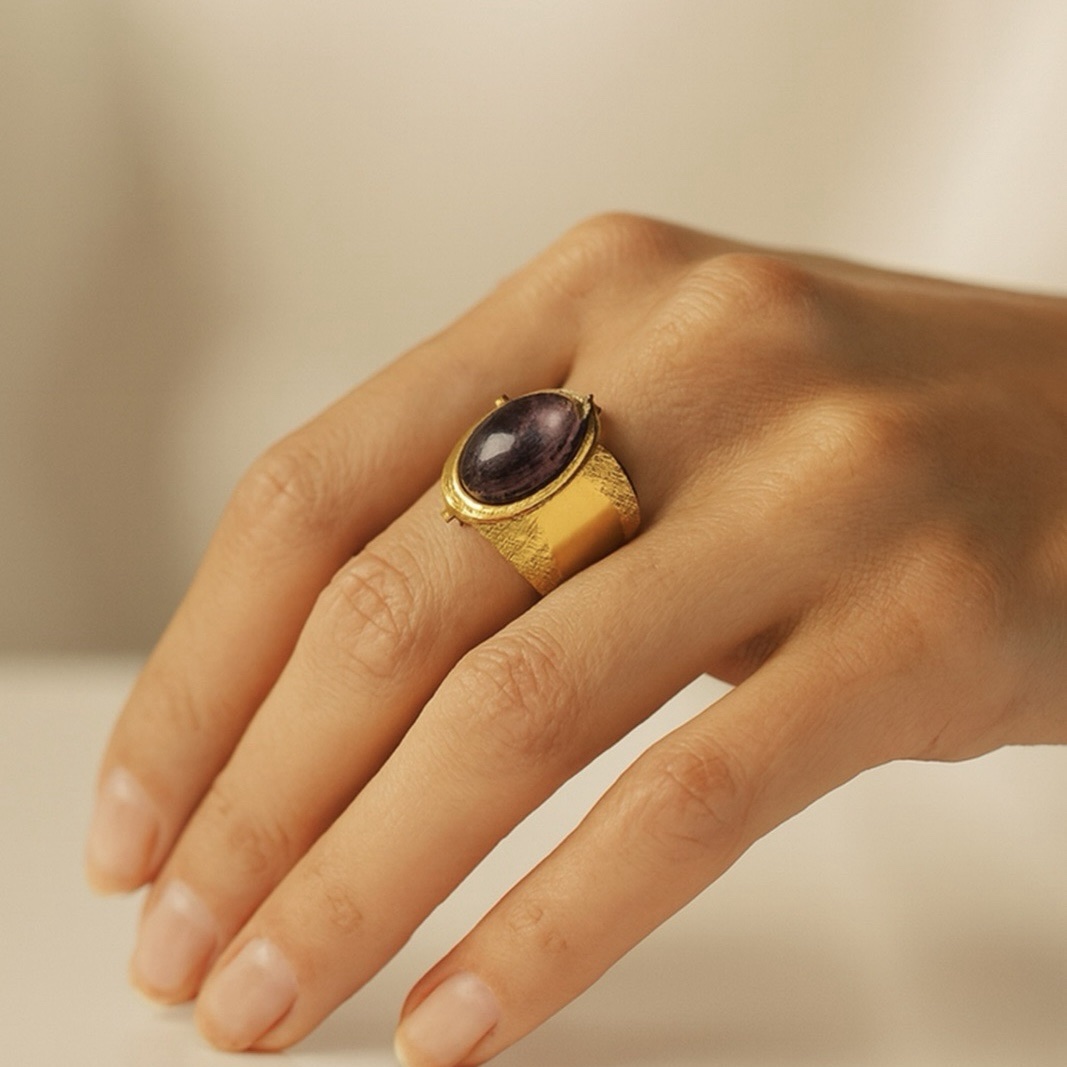 Το Evelina δαχτυλίδι με ημιπολύτιμο λίθο αμέθυστου σε εντυπωσιακή μωβ απόχρωση.